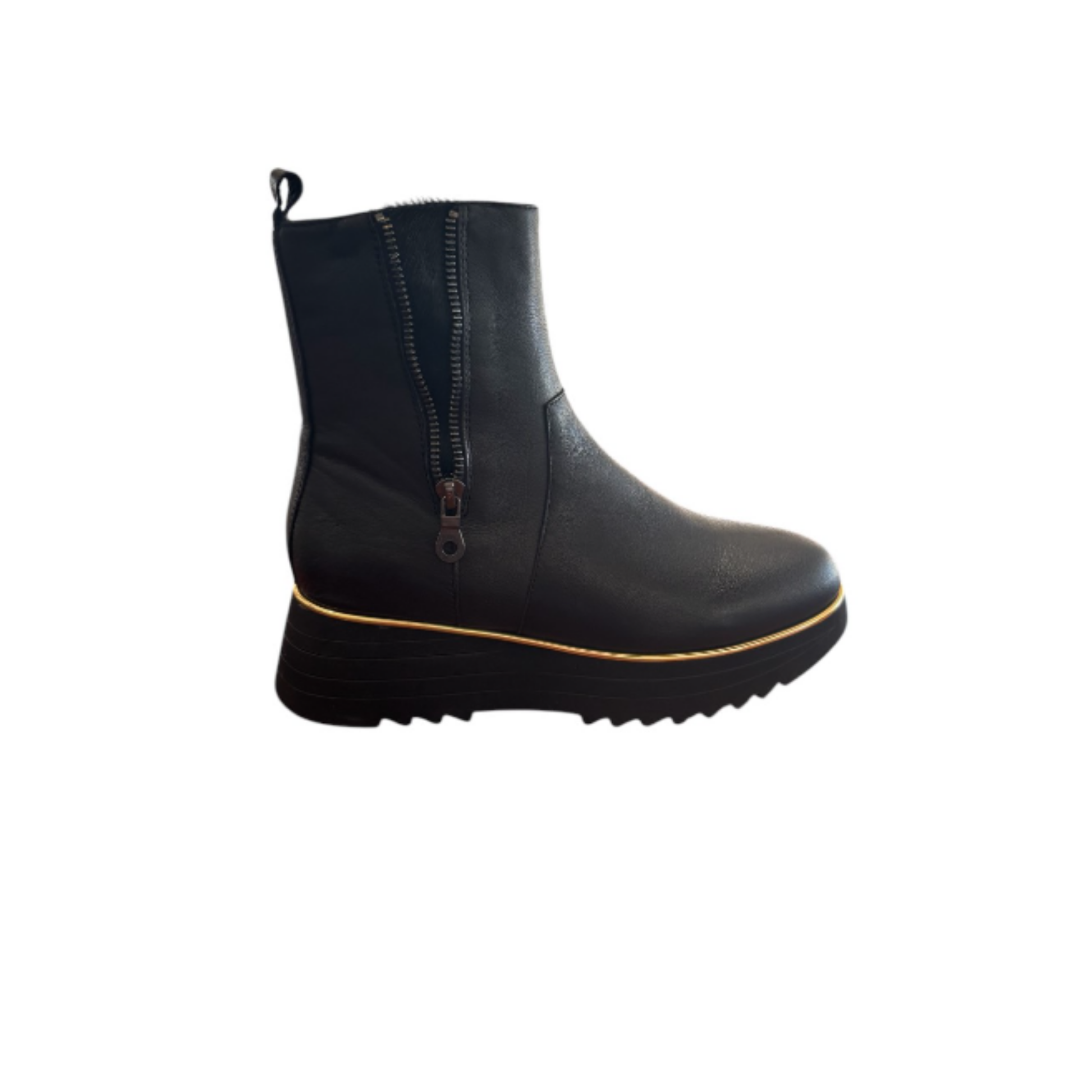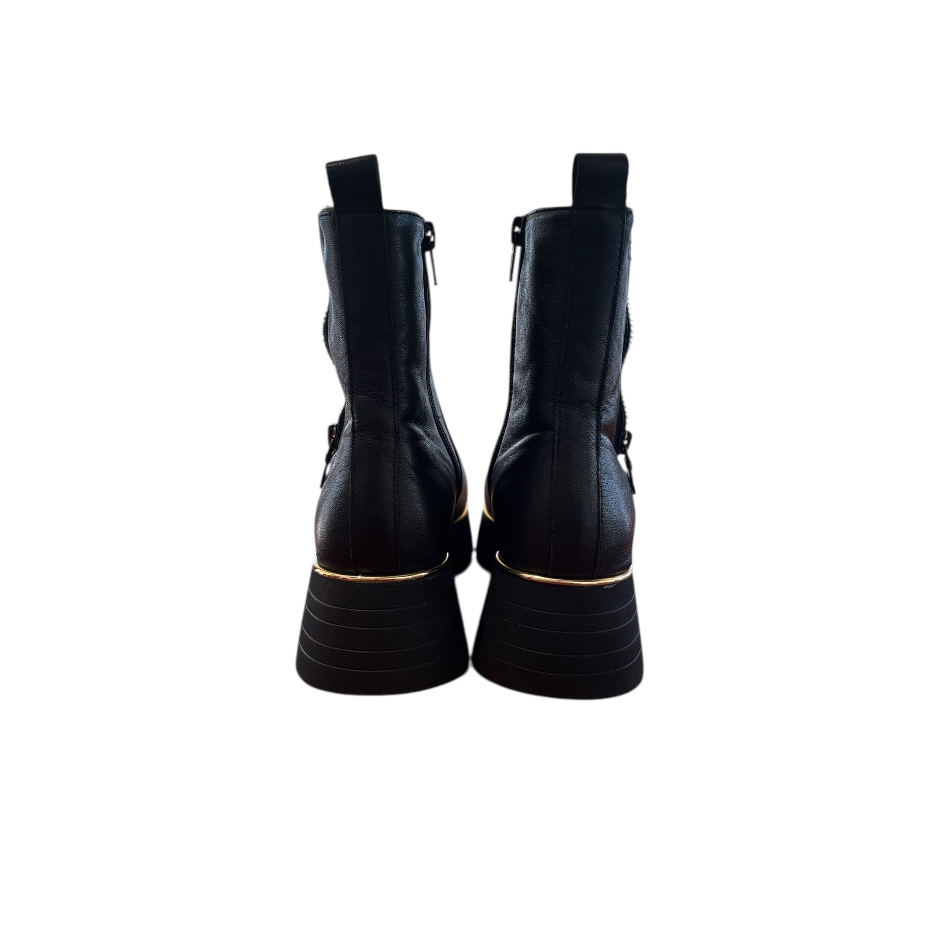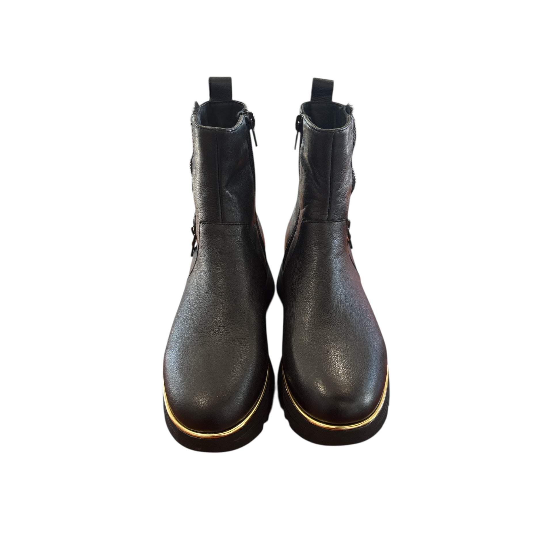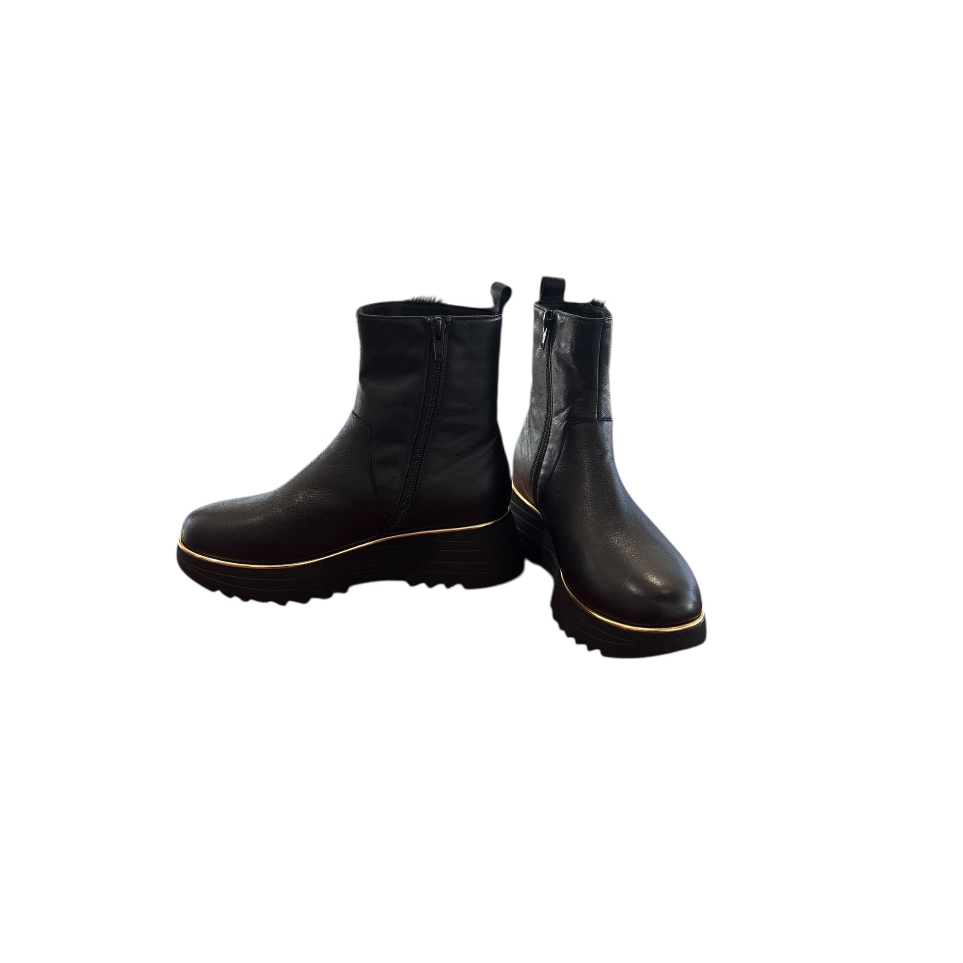 A casual, ankle boot, edgy with accents of gold in the detailing on a stripe platform sole. Super smooth leather and ultra lightweight. Pair these boots with cropped jeans, midi skirt or tailored trousers. True to size for most, leather will soften with wear for a more custom fit.