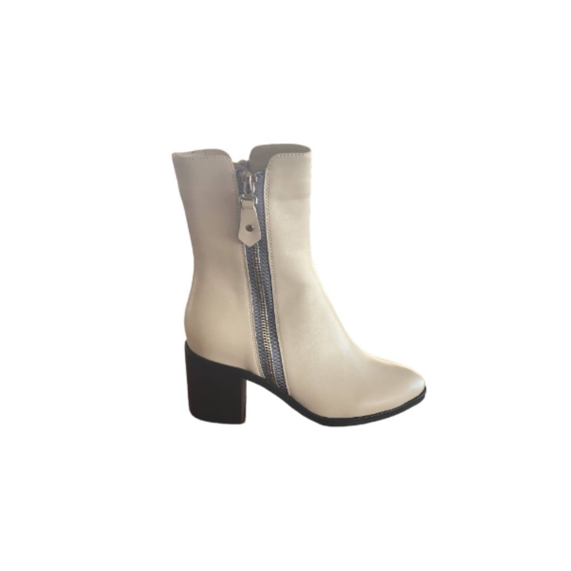 A mid-calf leather boot featuring a colorful external zip and a comfortable 6.5cm block heel. Its smooth leather finish and unique design elements make it a standout piece for any wardrobe. Pair with skinny jeans and a slinky top for a posh look or style with a midi dress to add an edge to feminine outfits. Fits true to size; if you have wider feet or are between sizes, consider sizing up.