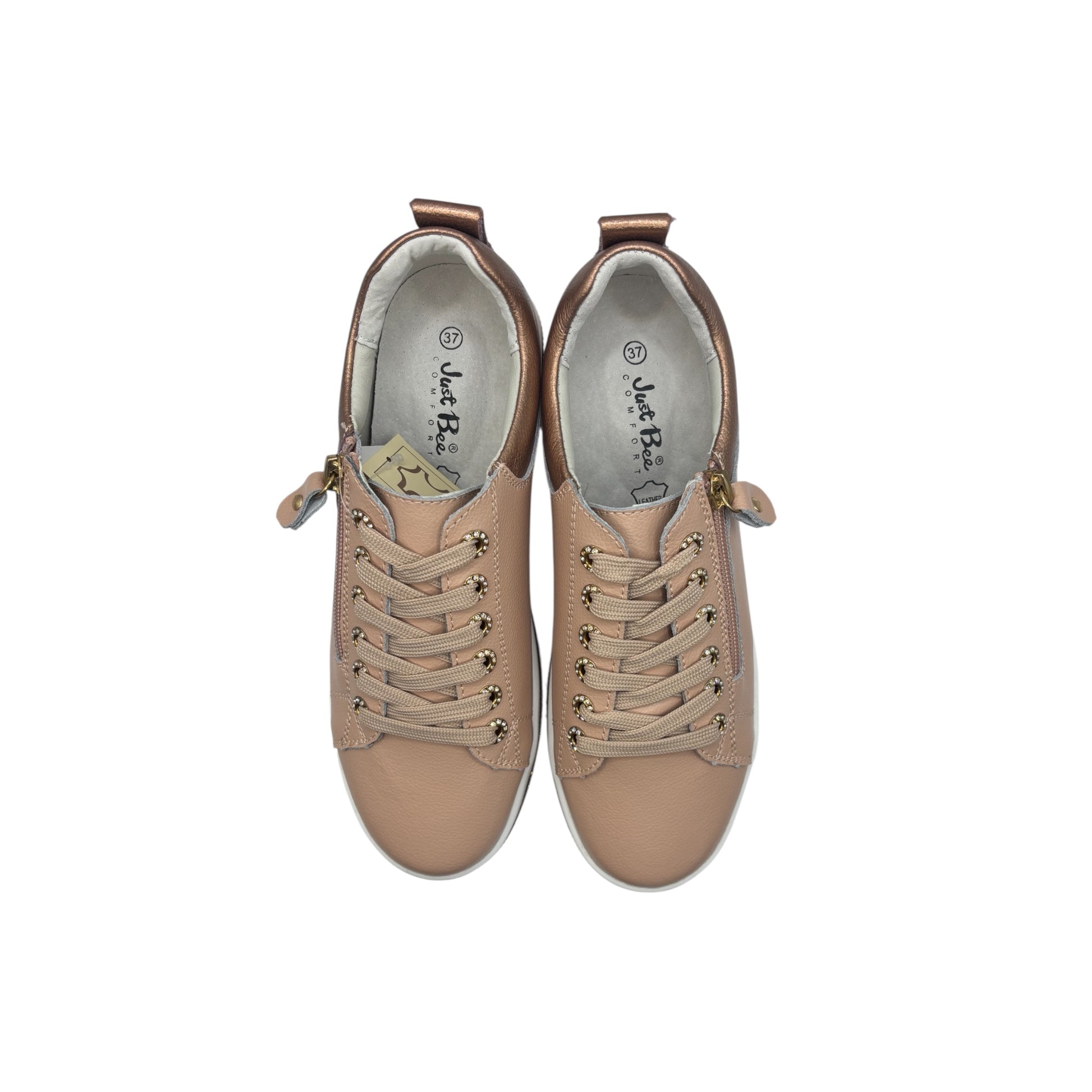 The Just Bee Cindy sneaker brings a touch of glam to everyday comfort. Crafted with a soft leather upper in a warm nude tone, it’s set on a platform sole wrapped with shimmering gold embellishment for subtle sparkle. A side zip makes them easy to slip on and off, while the cushioned insole keeps your feet happy all day. Perfect with cropped trousers, casual skirts, or jeans for a dressed-up take on sporty style. Fits true to size, with a removable insole for those who prefer to use their own orthotics.