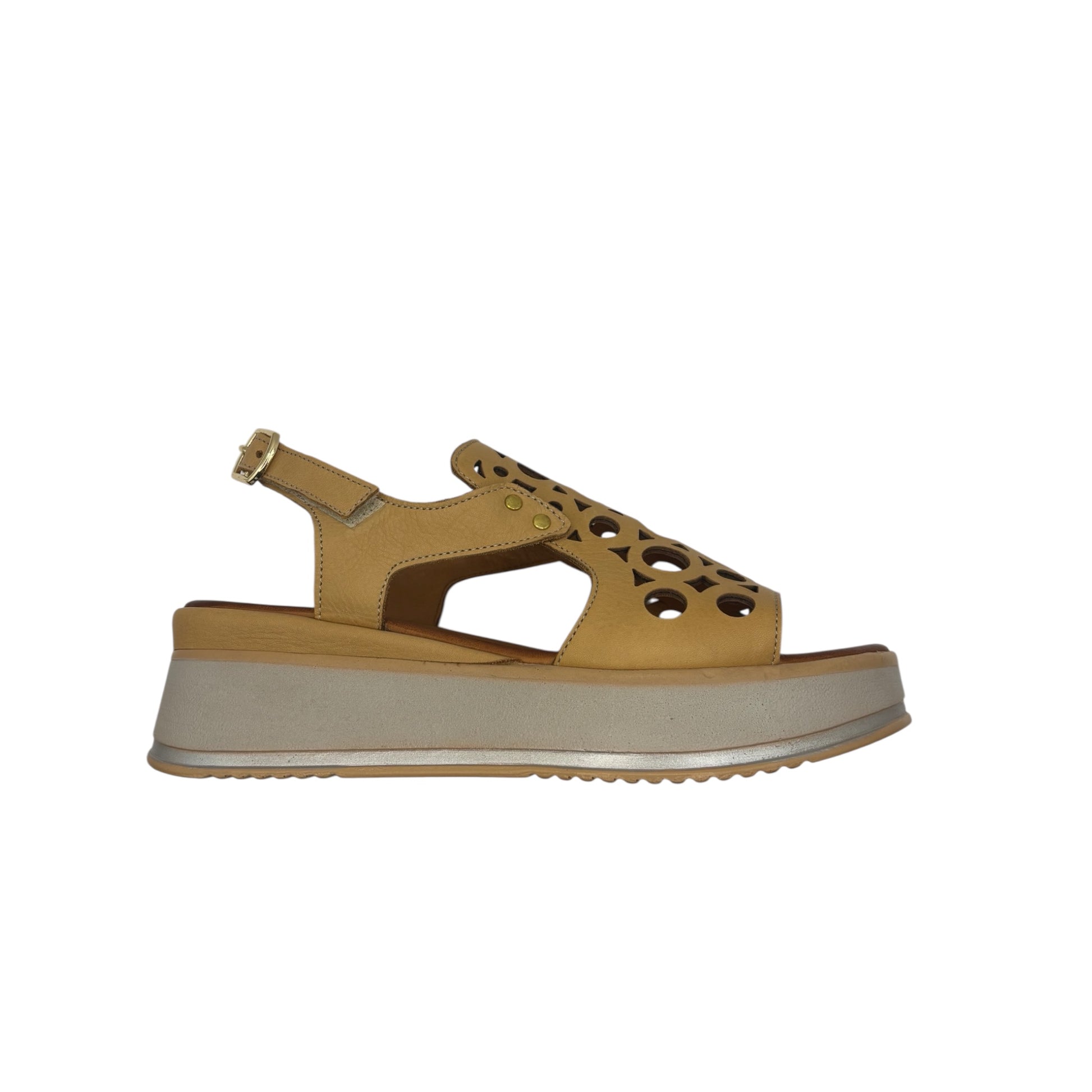 Dampier makes a bold summer statement with its playful geometric cut-outs and elevated platform sole. Crafted from soft leather in a warm, versatile tan, it offers breathability and standout style without sacrificing comfort. The slingback Velcro strap with a gold buckle keeps the fit secure, while the chunky platform gives you height and confidence without the strain of a heel. Perfect for pairing with everything from relaxed linen trousers to floaty dresses, Dampier is your go-to for all-day wear with a fashion-forward twist. True fit.