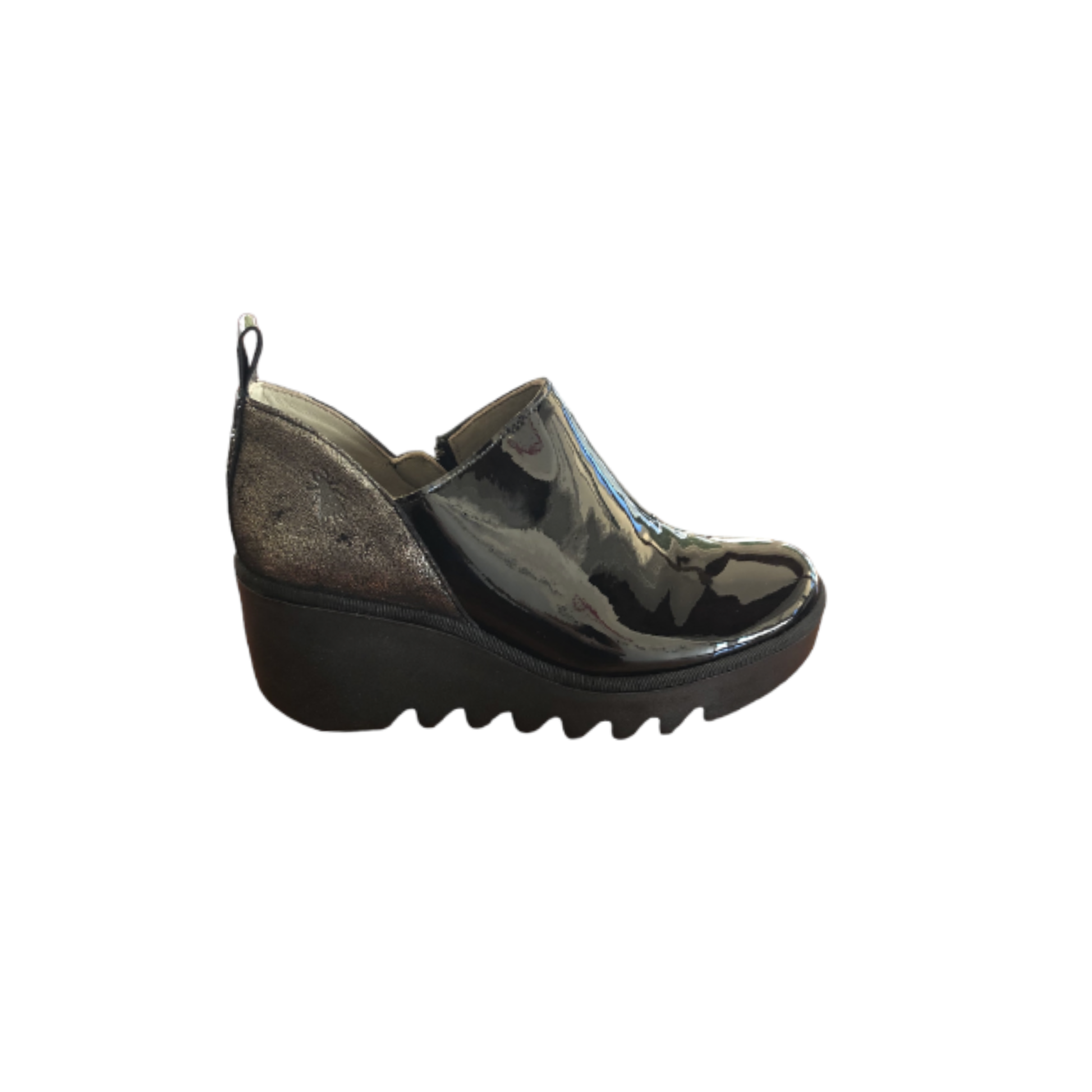 Made in Portugal, Fly London Beli is bold, glossy, and unapologetically chic. With its high-shine patent leather front and metallic-textured heel, this sculpted wedge loafer makes a serious statement. The easy slip-on design is paired with Fly London’s signature ripple sole for all-day support and style. A cushioned footbed and slightly wider fit make it surprisingly comfy for such a standout shoe. Perfect with wide-leg trousers or a midi skirt when you want to add drama without sacrificing comfort. True to size, but roomy enough for those who like a bit more space through the forefoot.
