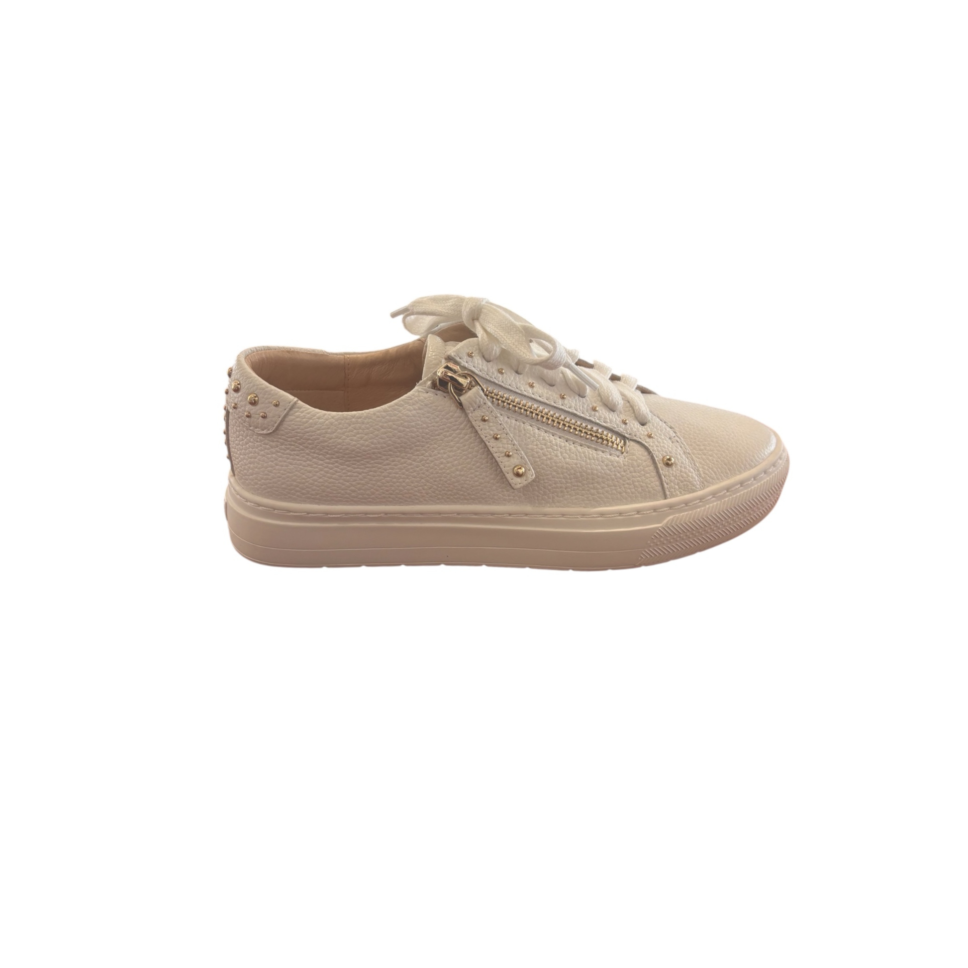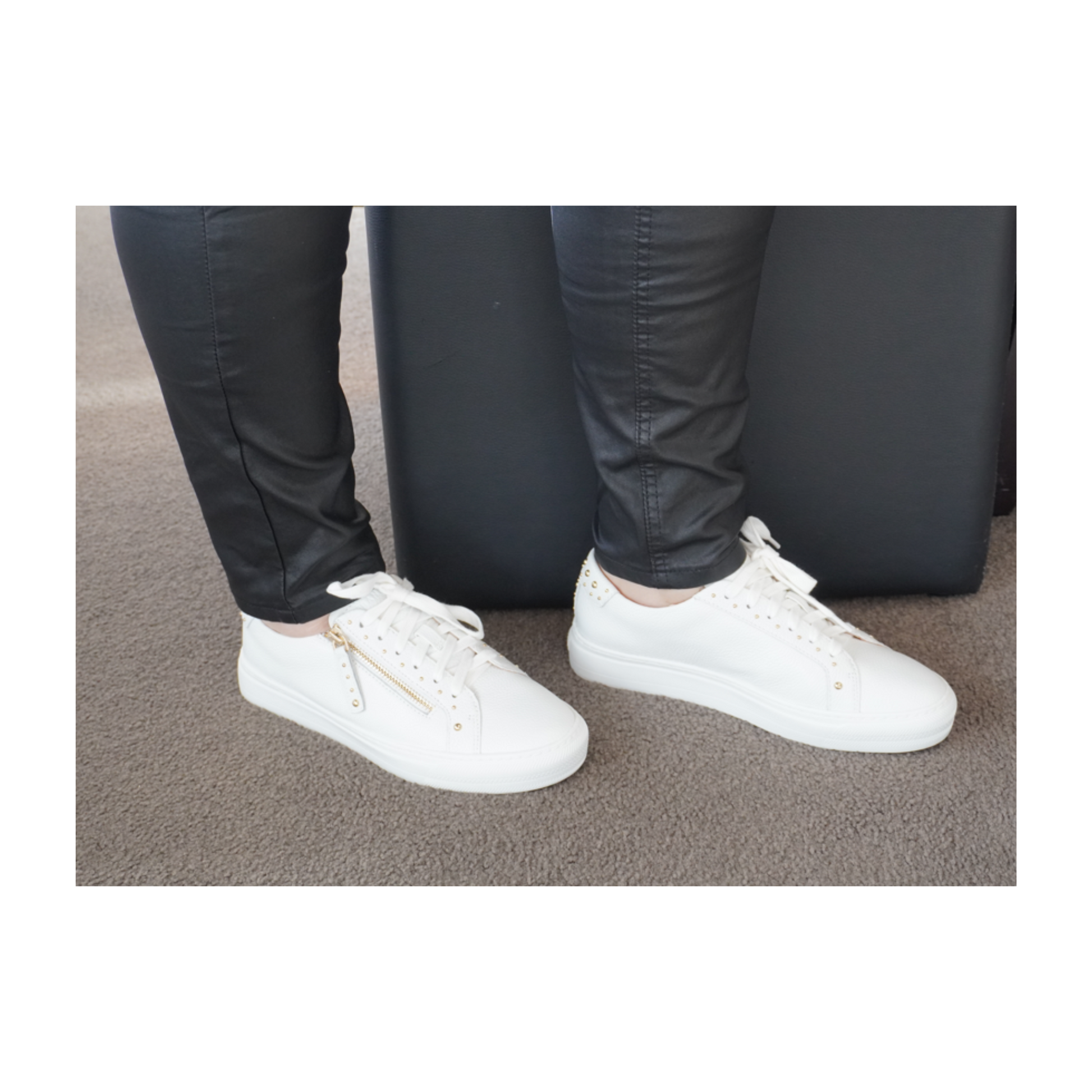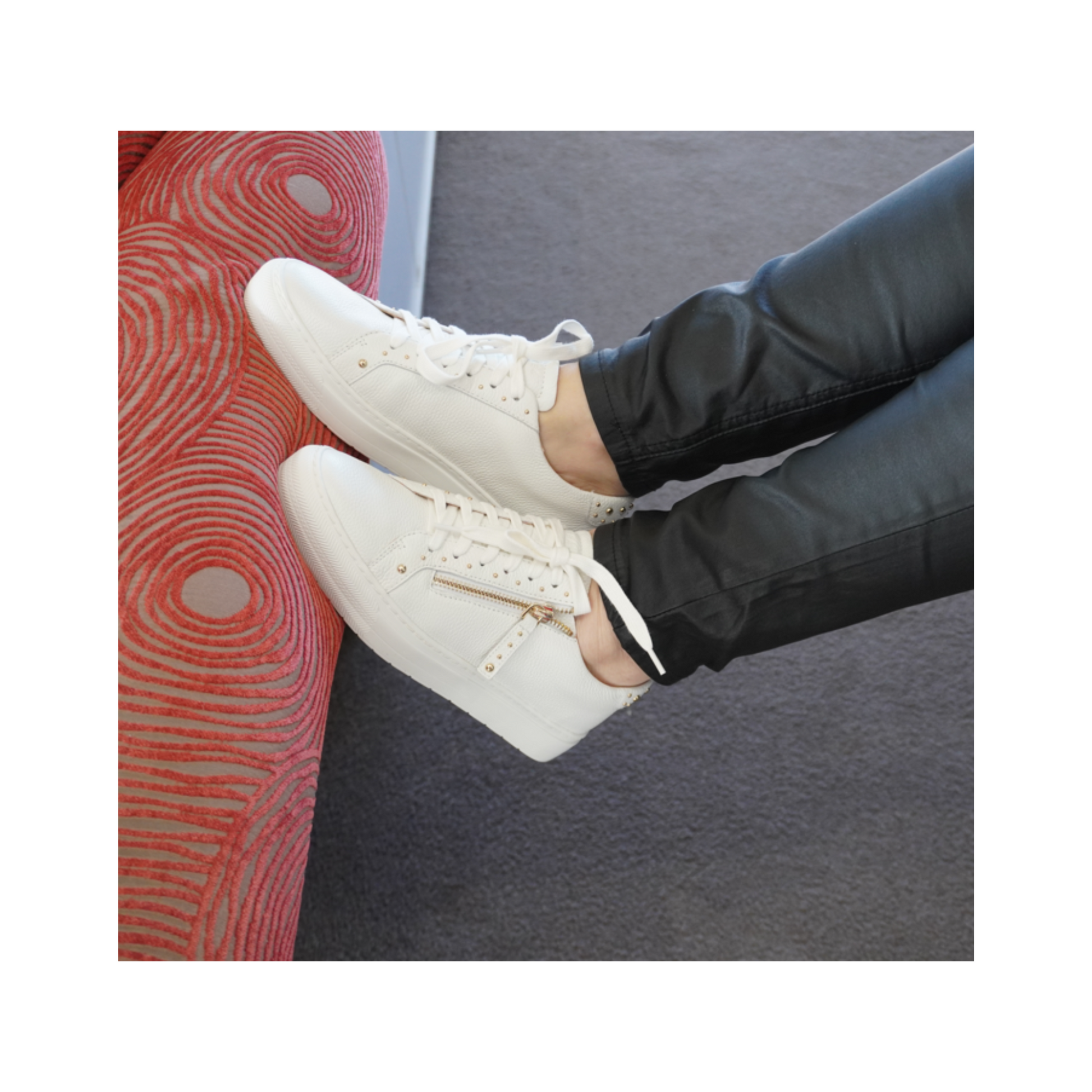 Frankie4 Billie is your go-to white sneaker—with a twist. Gold studs and a chic side zip elevate this staple to something special, while the podiatrist-designed footbed supports every step. The soft leather upper, cushioned heel, and sleek silhouette make Billie perfect for styling with everything from cropped denim and wide-leg trousers to dresses and skirts. Smart, stylish and made for movement—she’s a Sole Sisters essential. The sole includes adjustable heel, arch, and forefoot supports for personalized comfort, suitable for various foot shapes and needs. Each purchase includes a Sole Saver Pack® with options to adjust for regular, narrow, or wide feet, enhancing comfort and fit.