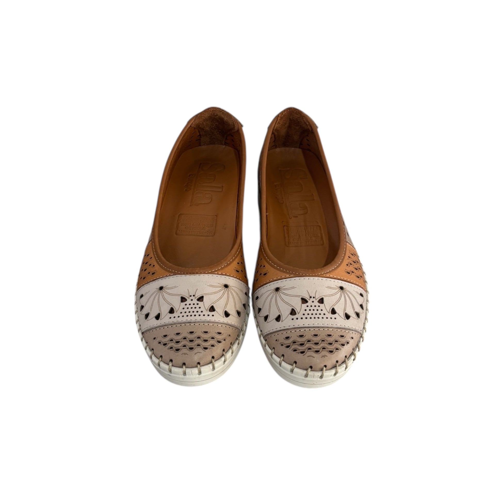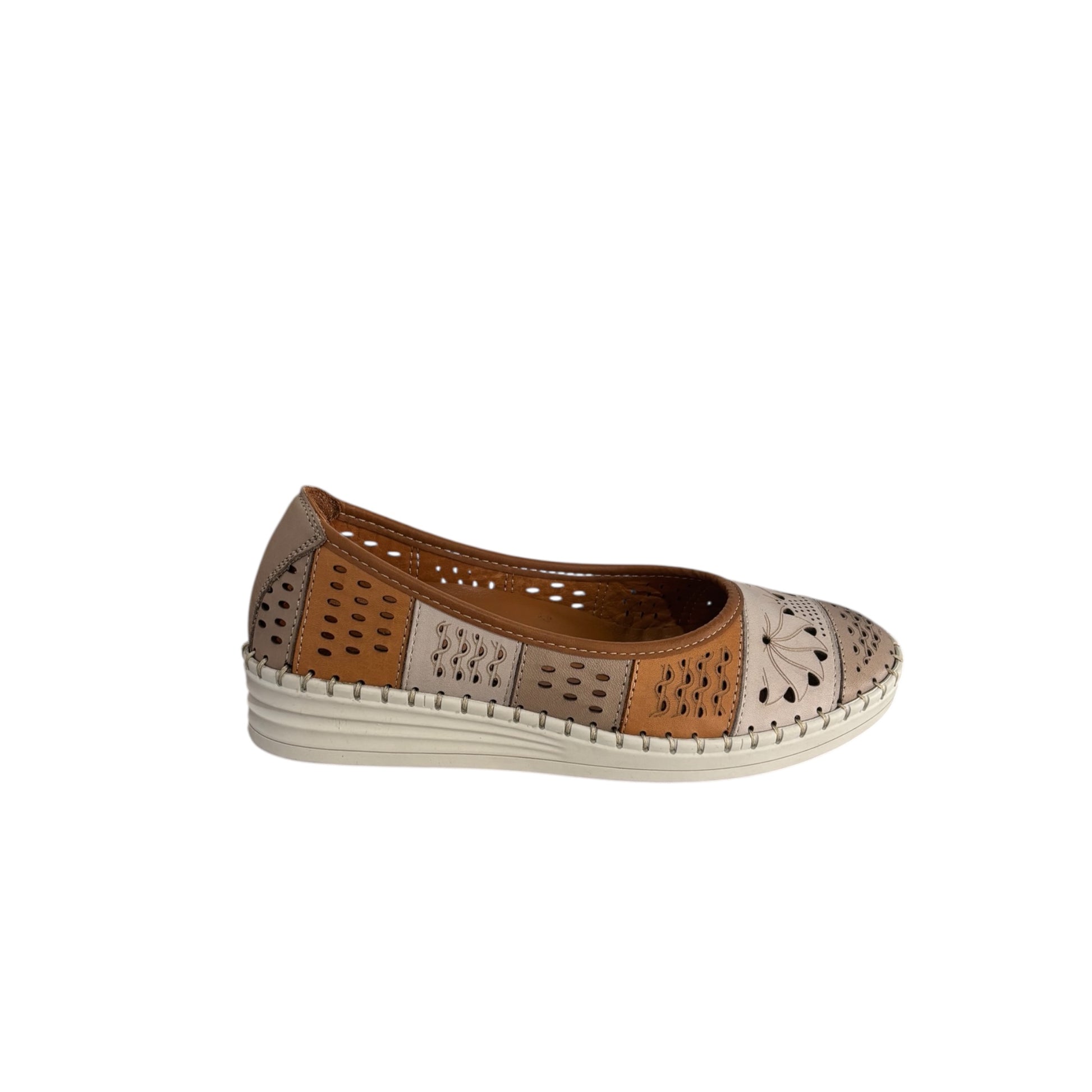 Soft, light, and beautifully detailed this slip-on is the kind of shoe that makes everyday dressing feel effortless. Crafted from supple leather, its cut-out floral design and patchwork tones of taupe and tan give it a warm, handcrafted feel that pairs easily with your wardrobe. A flexible stitched sole adds to the comfort, making it an easy choice for all-day wear. Pair with cropped linen pants or a flowy midi skirt for a relaxed summer look. The soft neutrals work beautifully with both warm and cool tones — ideal for travel, weekends, or days on your feet. Fits true to size