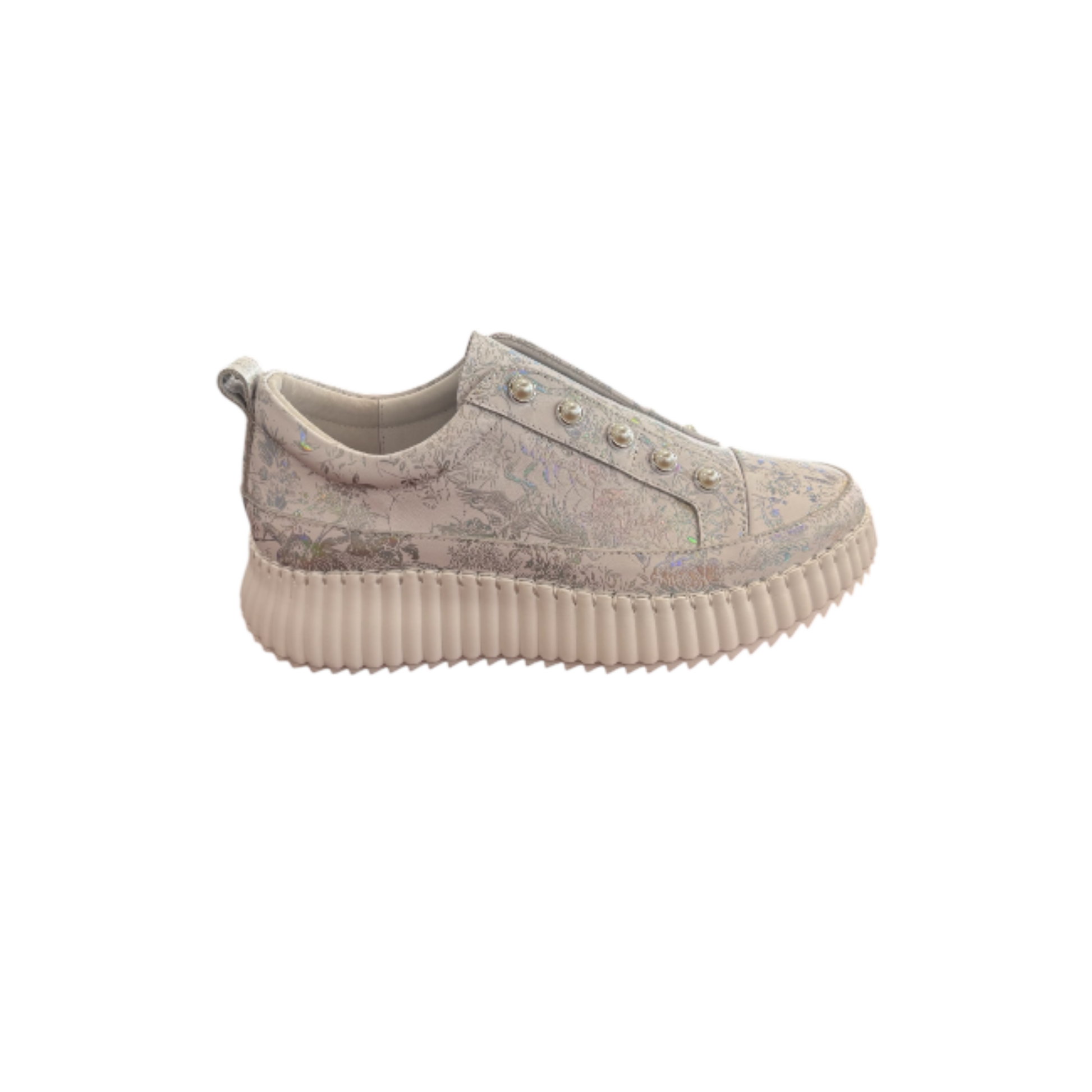 The Hinako Oriel is a standout slip-on sneaker that blends subtle sparkle with feminine flair. Its soft metallic floral print shimmers with every step, while decorative pearl buttons add an elevated, elegant touch. The chunky ridged sole offers both style and stability, giving a little extra height without compromising comfort. Wear Oriel with white linen pants or a flowing midi skirt for a polished yet playful look. This style runs true to size