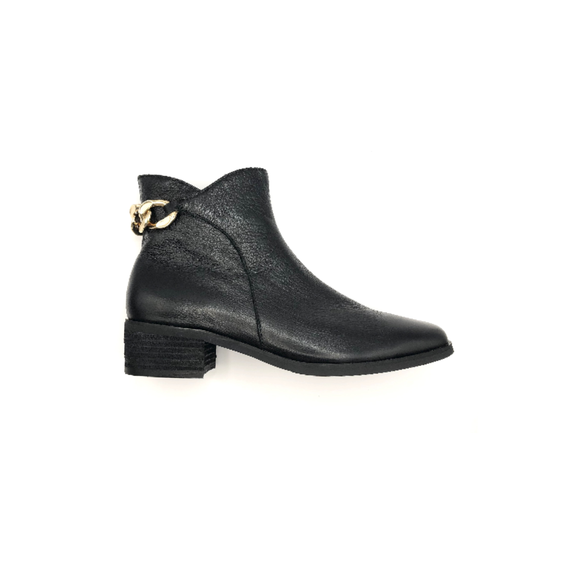 Meet Cara by Isabella—an effortlessly elegant ankle boot that balances everyday wearability with a touch of glam. With its softly curved topline and sleek almond toe, Cara elongates the leg while the gold chain detail at the back adds a polished finish. The stacked heel gives just the right amount of lift without sacrificing comfort. Style her with slim-leg trousers or midi skirts for a refined day-to-night look. True to size fit; ideal for average-width feet. Side zip for easy on-and-off.