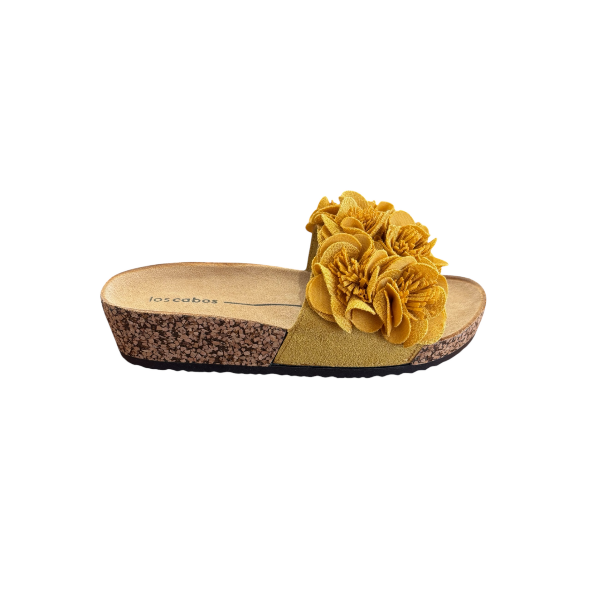 Bright, bold and unapologetically fun, the Los Cabos Corsage slide is a sunshine-ready style that brings instant flair to any outfit. It's the kind of shoe your sisters will admire—and probably try to borrow. With a comfy contoured footbed and soft cork-look sole, it's perfect for weekends at the market, summer brunches, or adding personality to everyday shorts and tee combos. The standout floral detailing adds a playful twist, and the mustard tone flatters all skin tones while working beautifully with denims, whites and earth tones. True to size for most.