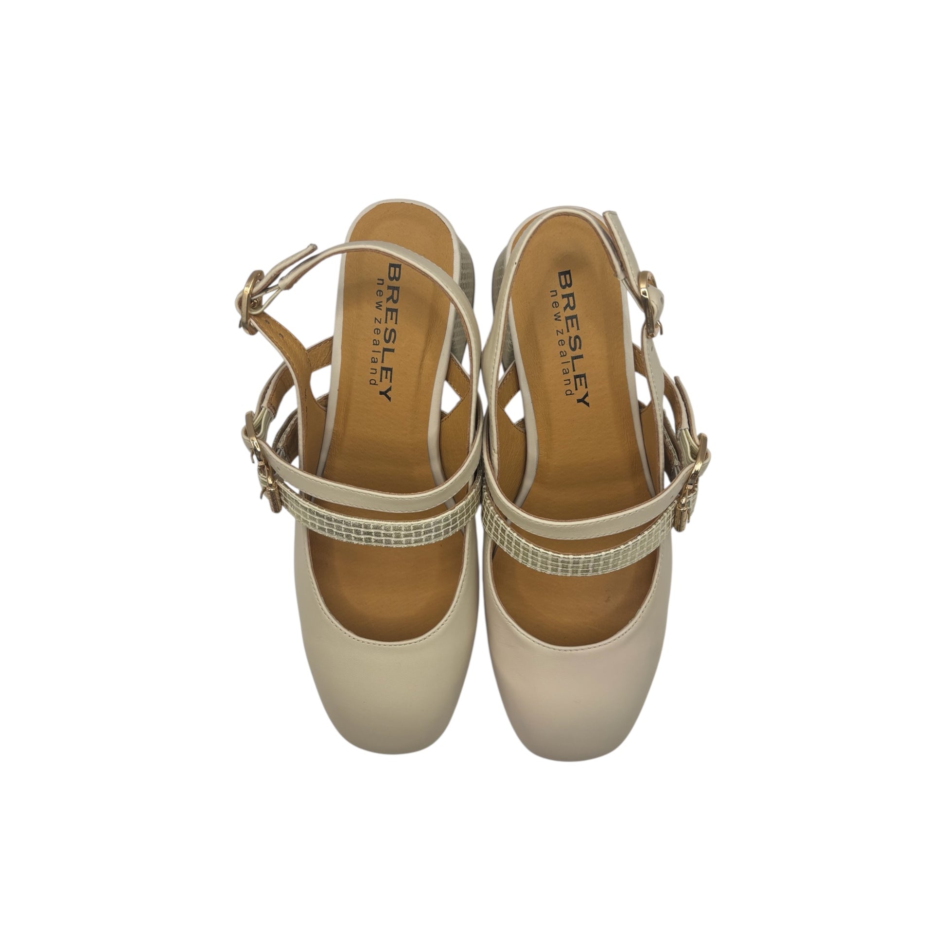 Chic with a retro edge, the Bresley Pleep is a standout block heel that’s both stylish and wearable. Crafted in smooth leather, it features double straps with gold buckles, a textured metallic detail across the foot, and a matching block heel that catches the light beautifully. The slingback design keeps the fit secure while adding an elegant finish. Ideal for weddings, evening wear, or special occasions – pair with a dress for polished sophistication, or add some glamour to tailored pants. Fits true to size.