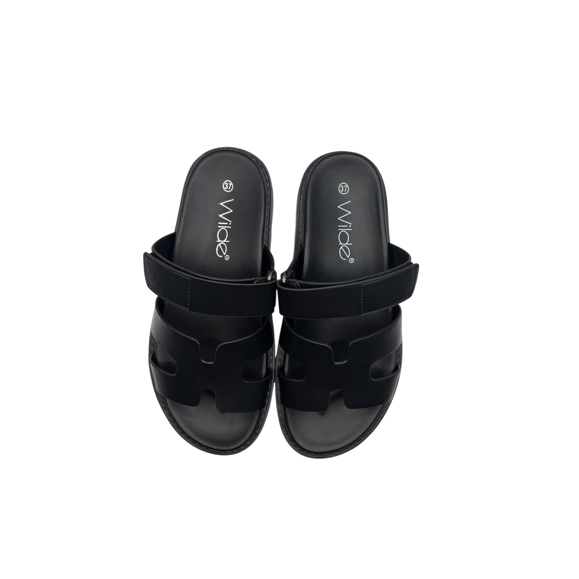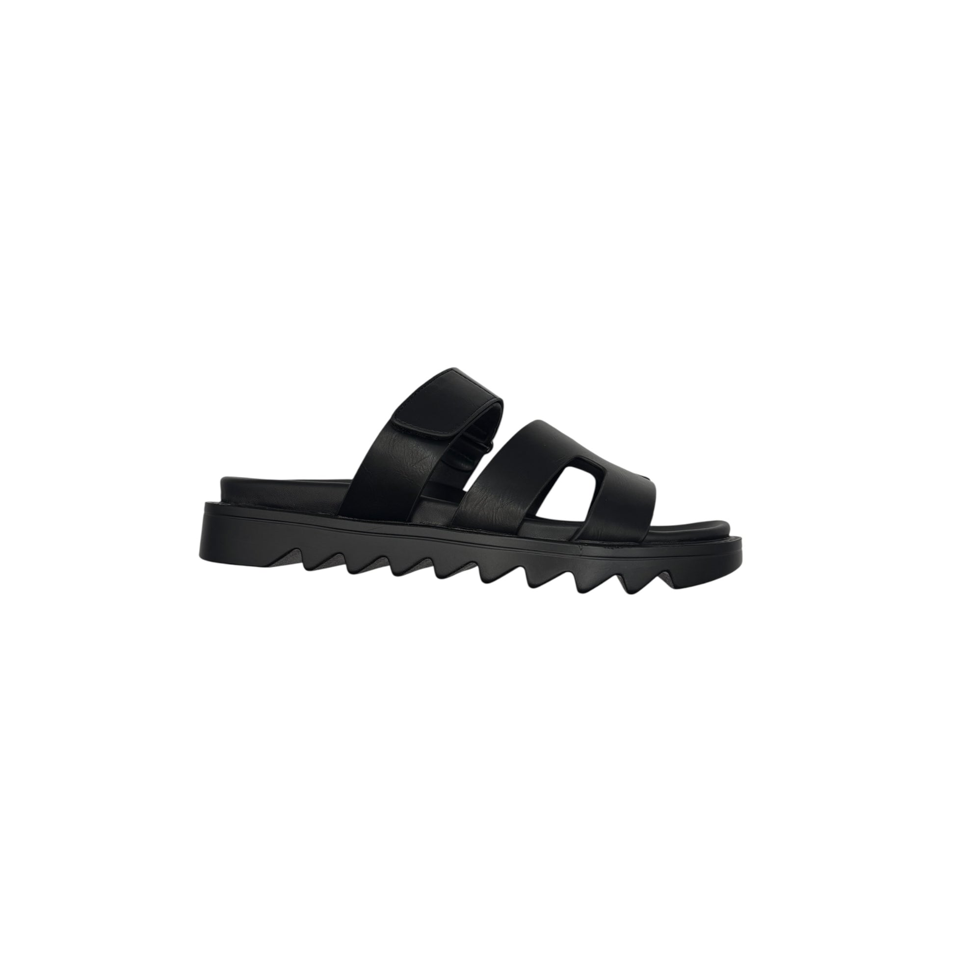 The Wilde Sawyer sandal is a sleek, modern slide designed for effortless style and comfort. With smooth straps, a contemporary cut-out design, and an adjustable Velcro fastening, it offers both a secure fit and a touch of edge. The cushioned footbed supports all-day wear, while the chunky zigzag sole adds grip and a subtle statement. The subtle toe grips help to keep your foot snugly in place. Perfect with cropped trousers, linen shorts, or a breezy maxi dress for a polished summer look. Fits true to size, with an adjustable top strap for a tailored fit.